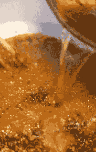 将炸香的热油分次泼入辣椒面中
